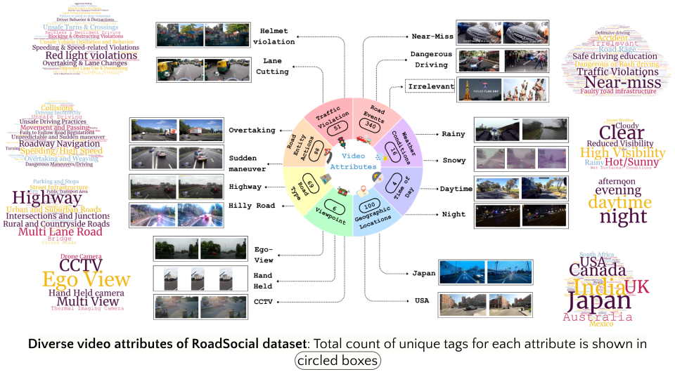 RoadSocial is a large-scale, diverse VideoQA dataset tailored for generic road event understanding from social media narratives. It differentiates itself from existing datasets by capturing the global complexity of road events with varied geographies, camera viewpoints (CCTV, handheld, drones) and rich social discourse. RoadSocial highlights: